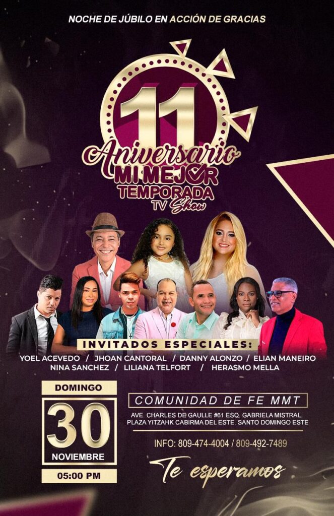 El ministerio comunicacional "Mi Mejor Temporada Radio Show" anunció la celebración de su 11.º aniversario con un solemne servicio especial de Acción de Gracias. El evento se realizará este domingo 30 de noviembre en la Iglesia Comunidad De Fe y Transformación Mi Mejor Temporada, pastoreada por Jhoel Guzmán e Idekel G.